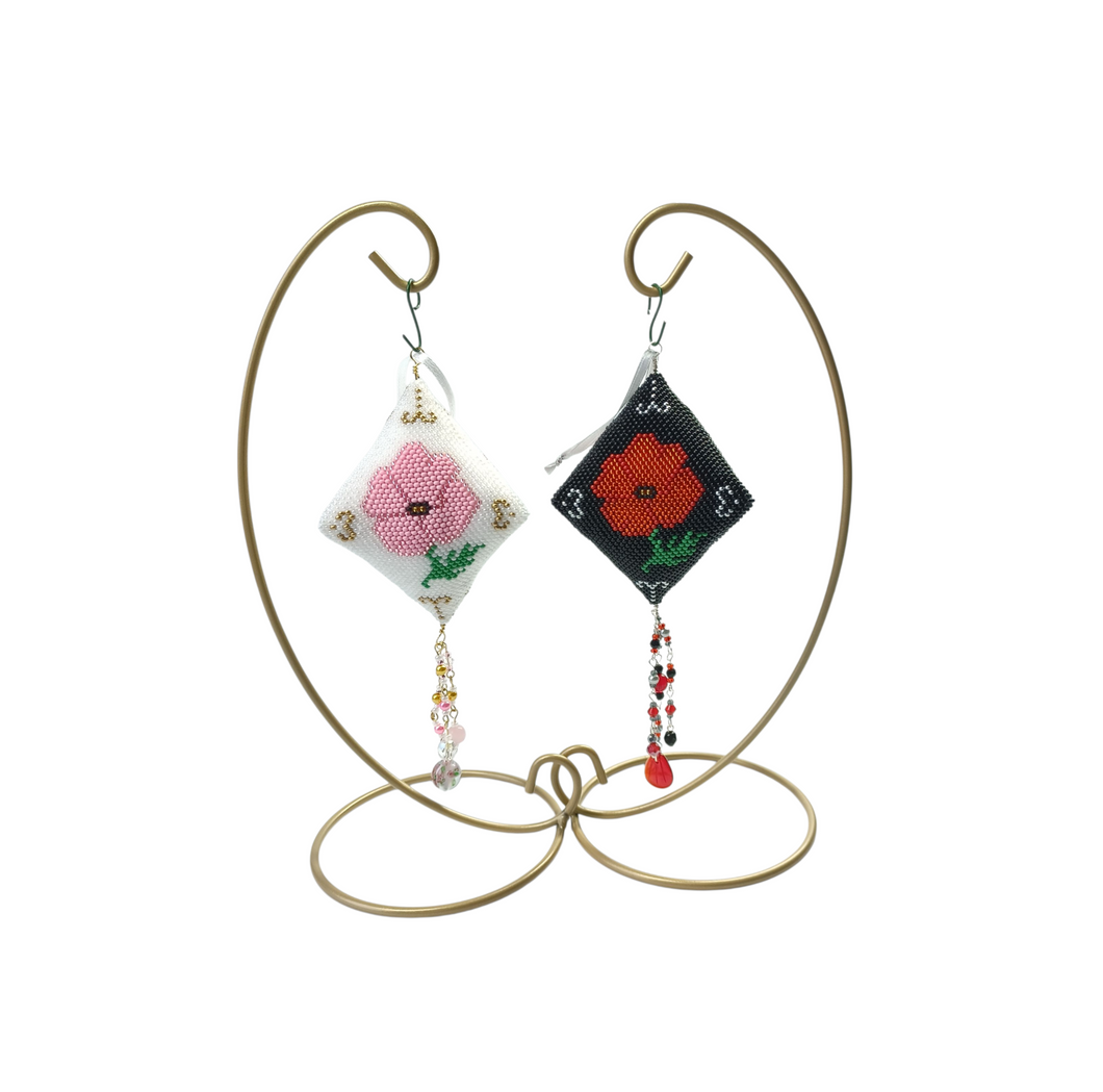 Hand stitched glass beaded 3d diamond shaped pod with poppy design. Made with over 3300 glass seed beads each individually sewn into place, with a selection of glass beads crating a tassel and finished of with a coordinating ribbon to hang.