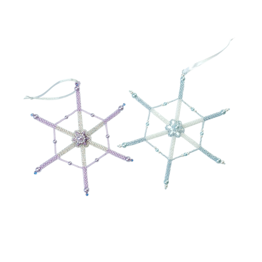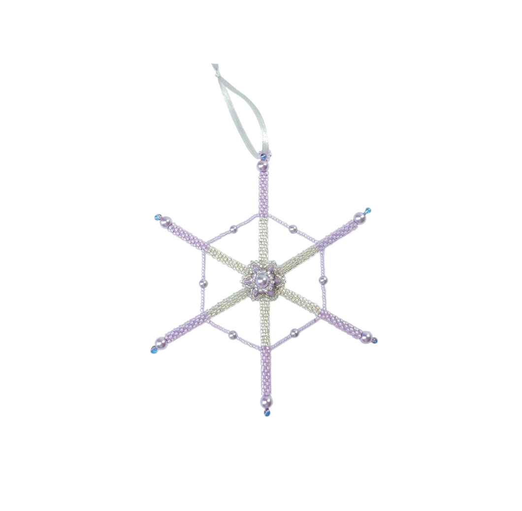 Hand stitched and hand crafted unique glass beaded Snowflake decoration. Made with a selection of glass pearl beads, glass twin beads and glass seed beads making this beautiful timeless decoration that sparkles beautifully in the light. Finished with a satin ribbon for hanging.