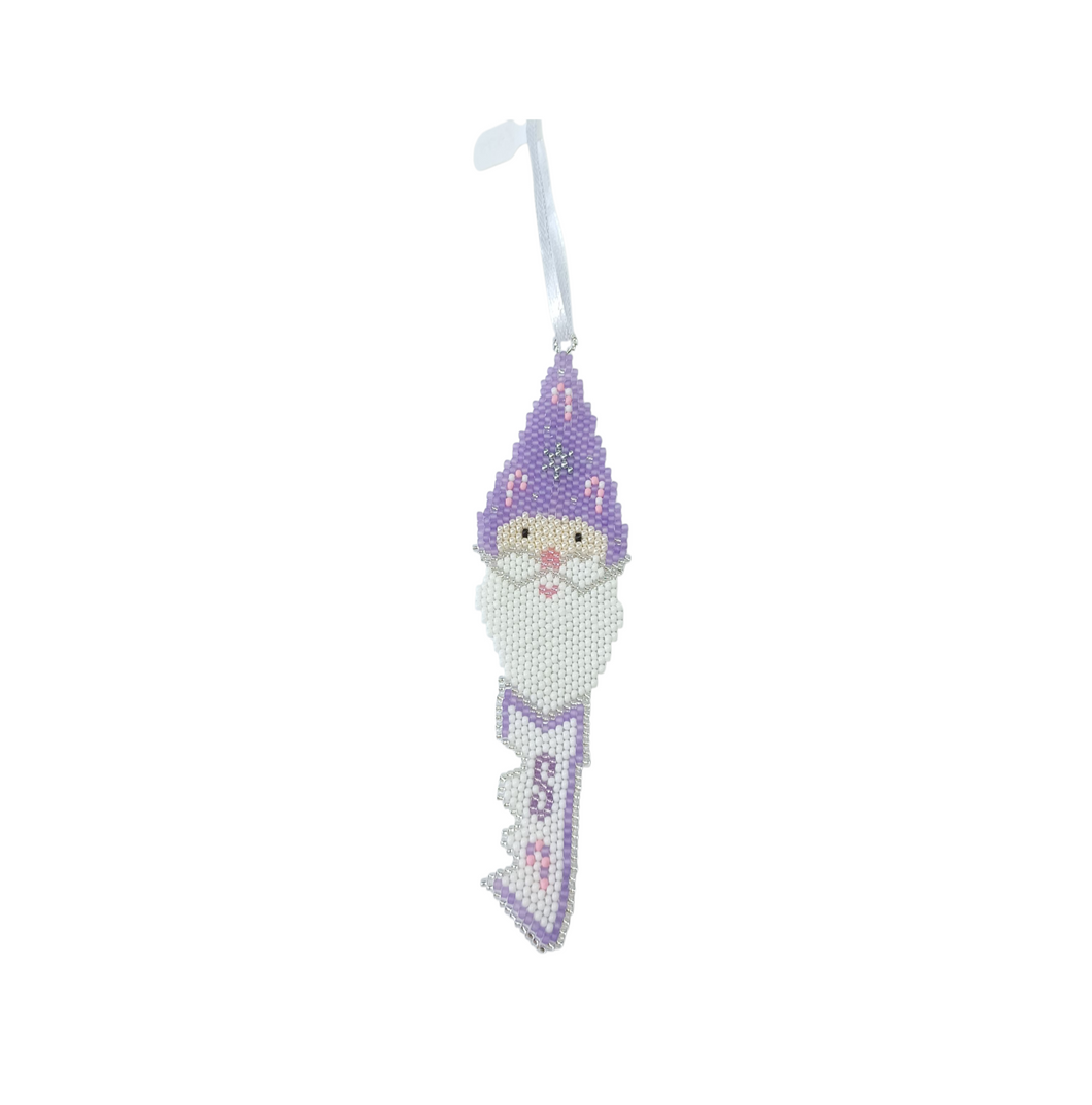 Hand stitched glass beaded Satan keys. A beautiful and different Magic key with a Gnome shaped Santa head shaping down into a key with a S stitched into the key section in a coordinating colour, their little hats have candy cane and snowflake patterns in them finished off with a satin ribbon to hang where you like.