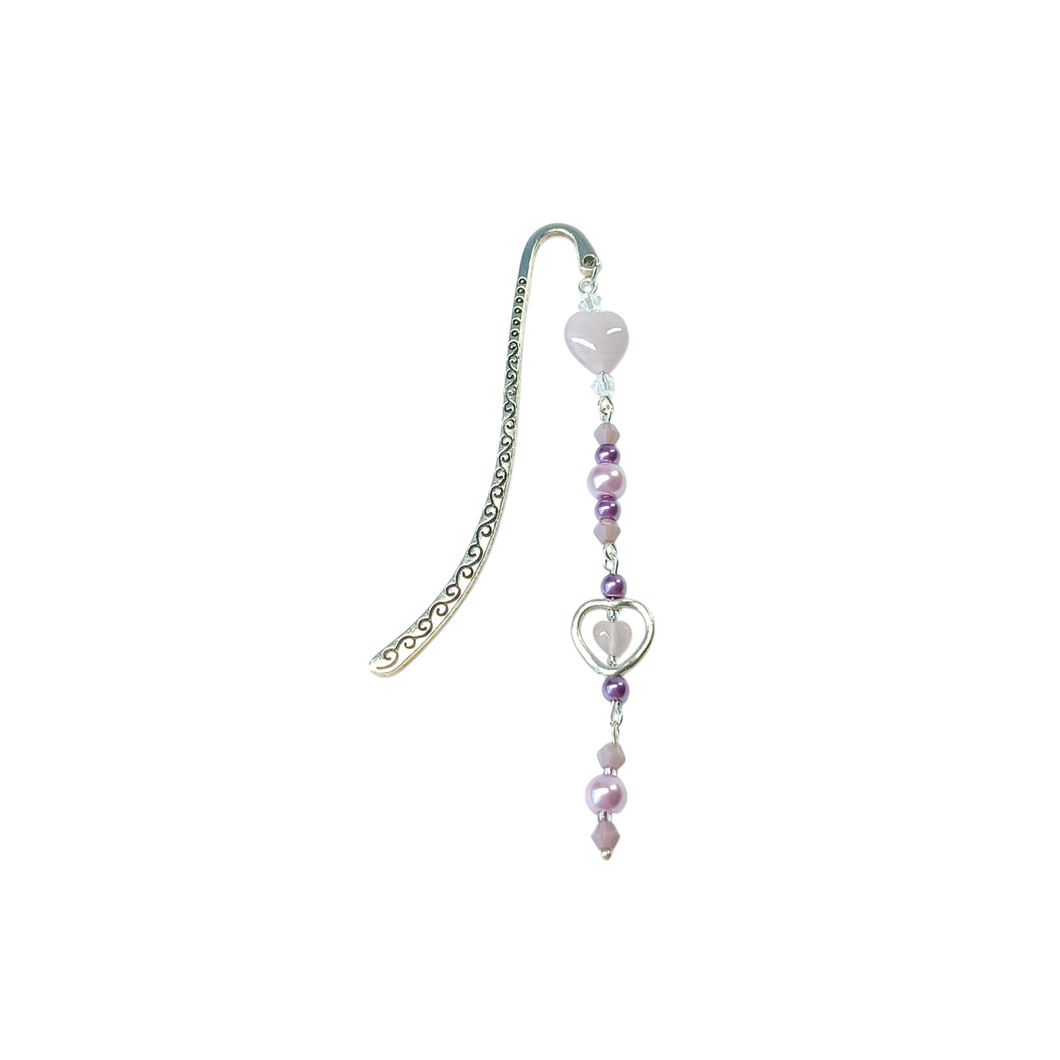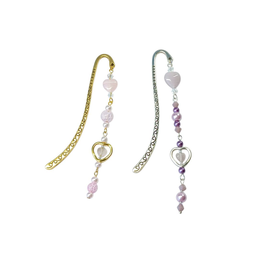 Hand crafted bookmarks with a difference. Made with a selections of glass heart shaped beads, glass pearls and crackled glass or bicone cut beads with a metal alloy heart charm and bookmark spine.