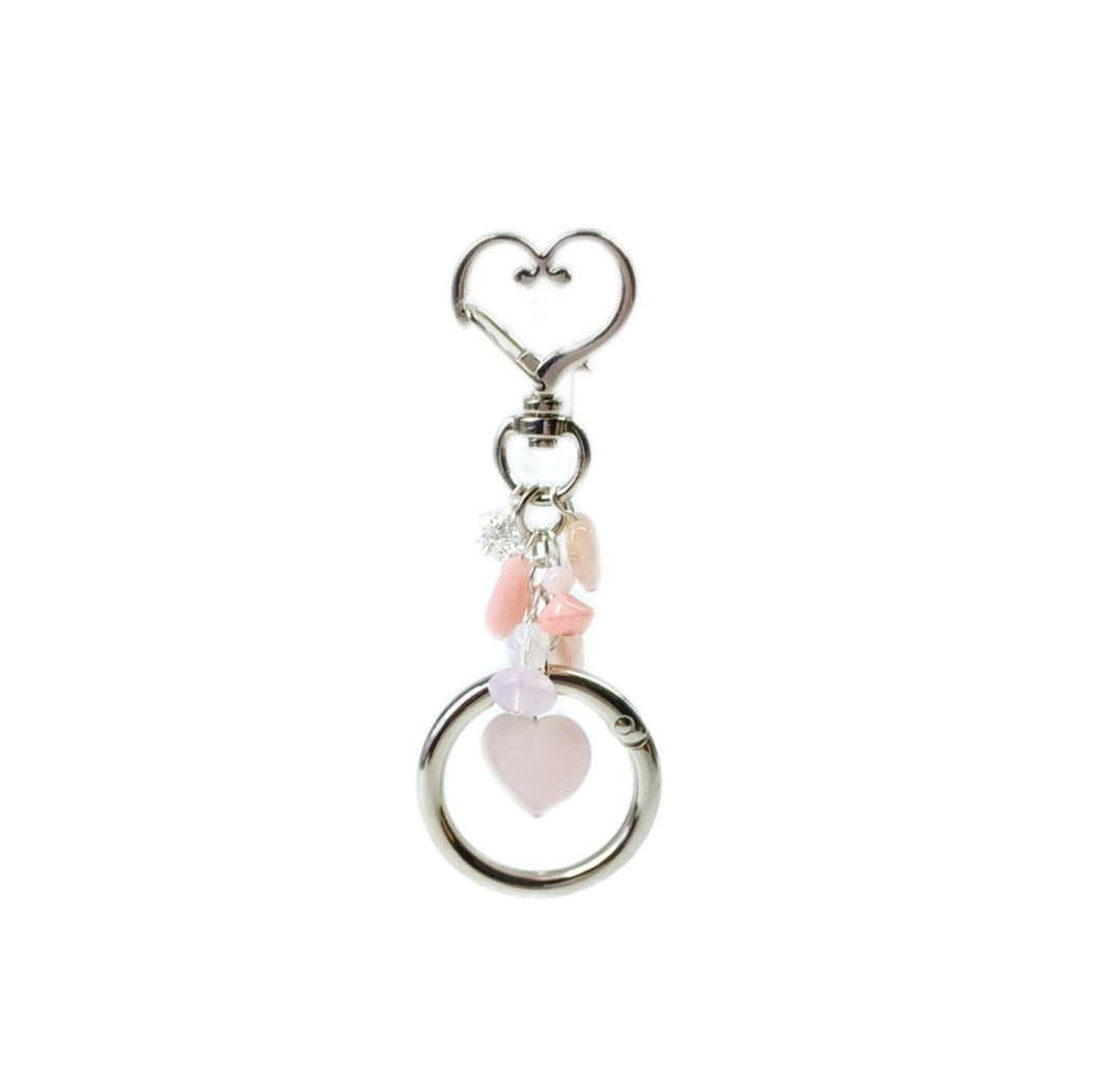 Hand crafted Metal alloy and glass beaded accessory. Perfect for holding your mini store cards, keys etc. Made with 2 push charms one round and 1 heart shaped with a selections of different shape and sizes of glass beads.