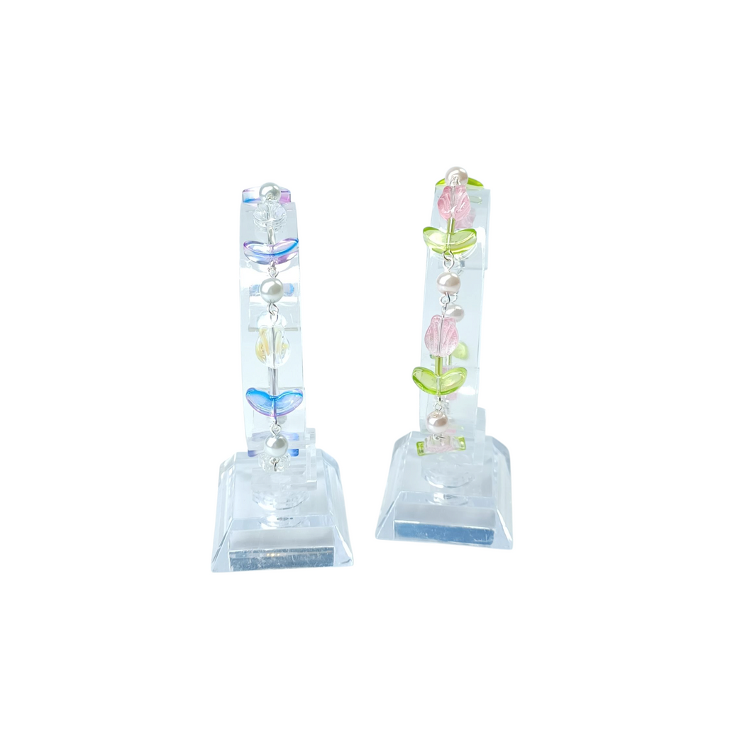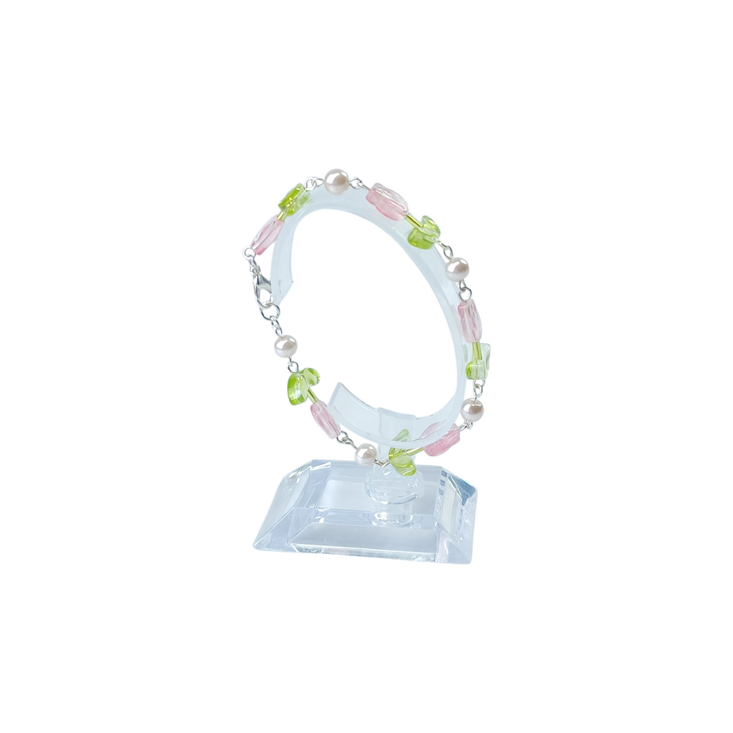 Hand crafted glass beaded bracelet in lovely Tulip shape, in 2 colour options, glass flower bud on top of a glass bugle bead as stem and duo leaf shaped base. Each bracelet has 5 tulip's with a glass pearl spacer and silver tone lobster claw clasp, making up these light weight, timeless and beautiful spring bracelets